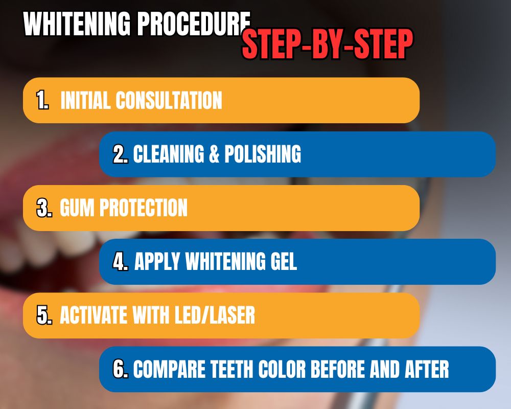 - The doctor will advise on the appropriate method: in-office whitening with LED/laser or take-home trays.